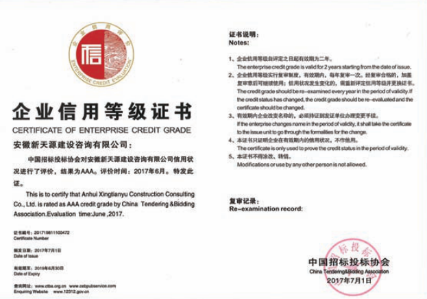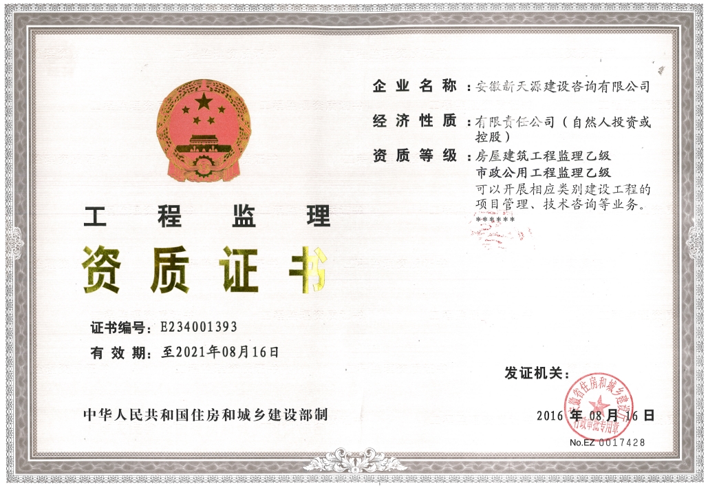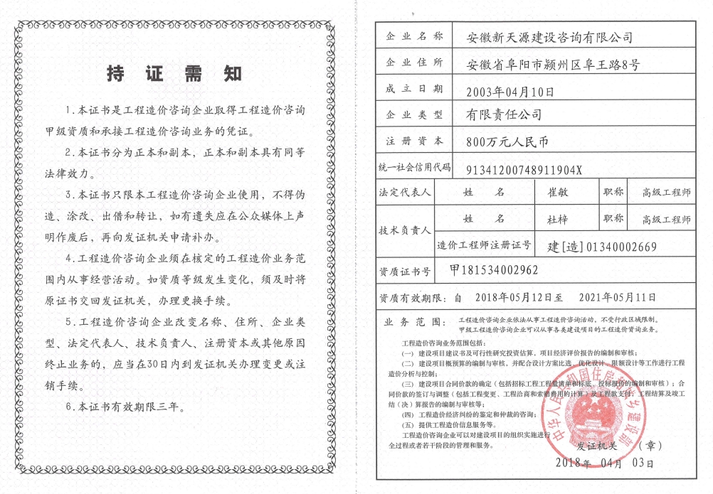 安徽新天源建設咨詢有限公司是一家全過程項目管理咨詢機構,重點開展PPP項目咨詢、BIM項目咨詢、招標代理、工程造價、工程監理、工程咨詢等業務。 公司成立于2003年4月10日,為股份制企業,現注冊資金5000萬元,辦公面積2200多平方米,法人代表崔敏。在成立同年,公司取得了國家發展改革委員會頒發工程咨詢資格證書,并成為安徽省工程咨詢協會會員單位。隨著近年來的不斷發展壯大,公司相繼取得了招標代理資質證書(工程招標代理資質資格證書、政府采購代理資格證書、水利工程招標代理資格證書、中央投資項目招標代理資質證書)。 2008年11月取得工程造價資質證書并成為阜陽市審計局審計協審定點單位; 2012年3月取得安徽省發改委固定資產節能評估資質證書; 2012年3月取得安徽省國土資源廳測繪資質證書; 2012年7月獲得安徽省經濟和信息化委員會第一批工業投資項目節能評估機構備案; 2012年9月取得水利工程監理資質證書; 2014年1月取得工程監理資質證書;現工程招標代理及工程造價已取得甲級資質,并開展了環境影響評價、工程測量、房地產評估等業務。